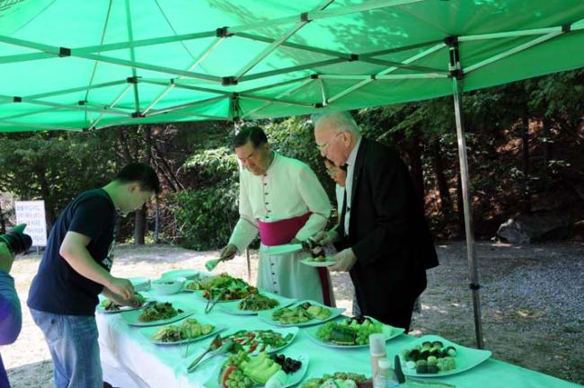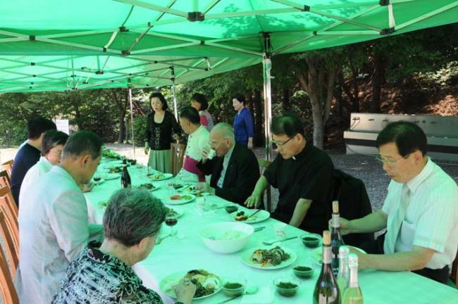 교황청 Giuseppe de Andrea 대주교님, 변기영 몬시뇰, 역촌동 본당 주임 정병조 신부, 수원 매교동성당 주임 이그레고리오신부, 천진암 성지 12시 순례객 미사 후 한식뷔페로 점심식사 (2012.06.19)